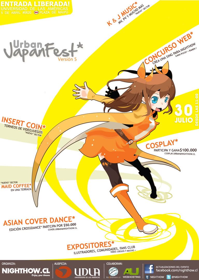 Encuentranos en Urban Japan Fest* Ver 5, que se realizará el día Sábado 30 de Julio en la Universidad de las Américas sede Maipú, ubicada en Av. 5 de Abril #0620, de 11:00 a 18:00 hrs.